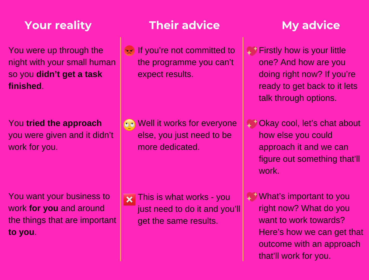 Here we do things differently, yes I'll hold you accountable and yes I'm going to push you to succeed but I'll do it supportively and compassionately because I want the best for you and your business - that means doing things in ways that give you more confidence, not less! Here's EXACTLY what I mean by that ⬇️