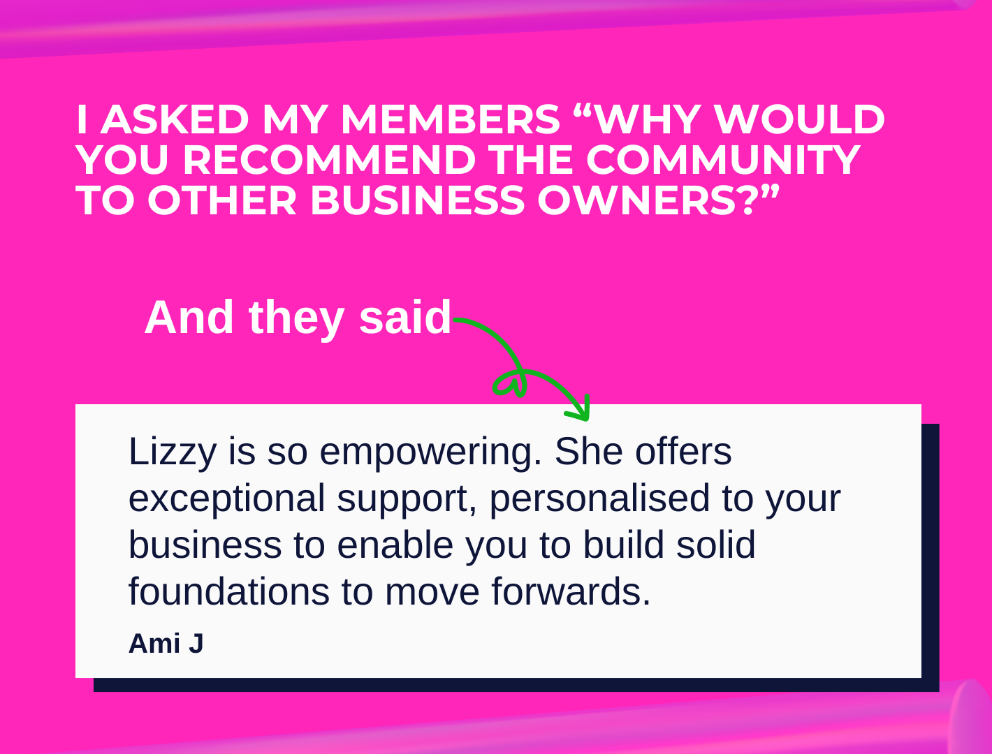 I joined because I wanted some more structure and organisation in my business. Since I joined, I've got more structure and accountability in doing tasks. Lizzy is an absolute legend for helping with organisation and structure - not just in my business but in my life too.